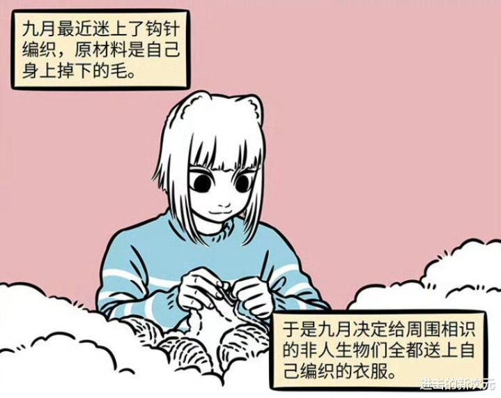 又到了非东说念主哉漫画更新的时分了,赵公明与关羽的故事还是适度了,此次九月惊艳回首。目下的九月越来越心灵手巧了,最近迷上了钩针编织,还给徐哼唧织了一件毛衣,御寒成果稀奇好,而烈烈看到之后,有点嫉恨了,也想要一件,九月管待了。仅仅九月给烈烈织衣服太费毛了,底下就让咱们沿途来潜入望望吧。 九月在责任适度之后,也驱动尝试粗造我方的闲余时分,于是便想着学一个妙技。九月想来想去,临了接管了钩针编织,而且九月一首先,就留恋了,深陷其中,而况九月的原材料也不必单独去购买,只需要用我方身上掉下来的毛发就可以了