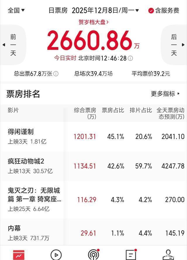 票房敕令力,还得看肖战。 01 肖战主演的《得闲谨制》以零宣发突袭贺岁档,上映三天票房突破2亿,票房占比连络三日超排片占比一倍以上,口碑发酵激发“自来水”效应,成为2025年末最逆袭的国产黑马! 领域12月8日,累计票房达2.03亿,单日票房从瞻望1700万上调至2041万,连络跑赢瞻望,票房占比达34.4%(排片仅20.7%)。 制作资本仅4000万,首日分账票房已遮蔽资本;网络播映权被腾讯、爱奇艺以3亿/家买断,未上映即盈