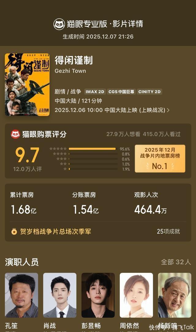 01 肖战主演的《得闲谨制》以零宣发突袭贺岁档,上映三天票房突破2亿,票房占比连络三日超排片占比一倍以上,口碑发酵激发“自来水”效应,成为2025年末最逆袭的国产黑马!