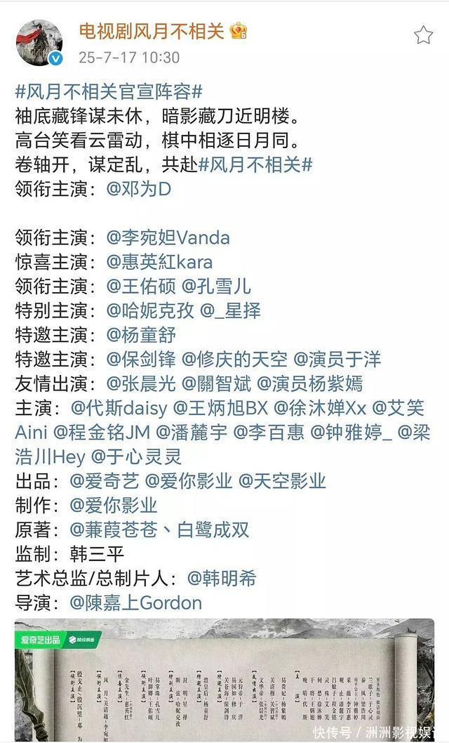 《风月不商量》官宣主演声威,邓为“空行咖”新番位。 7月17日,《风月不商量》官宣主演声威,邓为行动领衔主演的姓名“邓为D”被单独置于第一瞥,并给与“回车键+空格”形式,即空两行与其他演员离隔,这种排版解读为“独特大男主地位”,也被捉弄为“空行咖”新番位方法。 邓为粉丝在官宣前已屡次维权,指出邓为在剧组一周上二休五,戏份占比不及20%,驰念剧方运用其流量却削减戏份。官宣后粉丝强调若戏份与番位不匹配,就是剧方糊弄。 《风月不商量》该剧改编自白