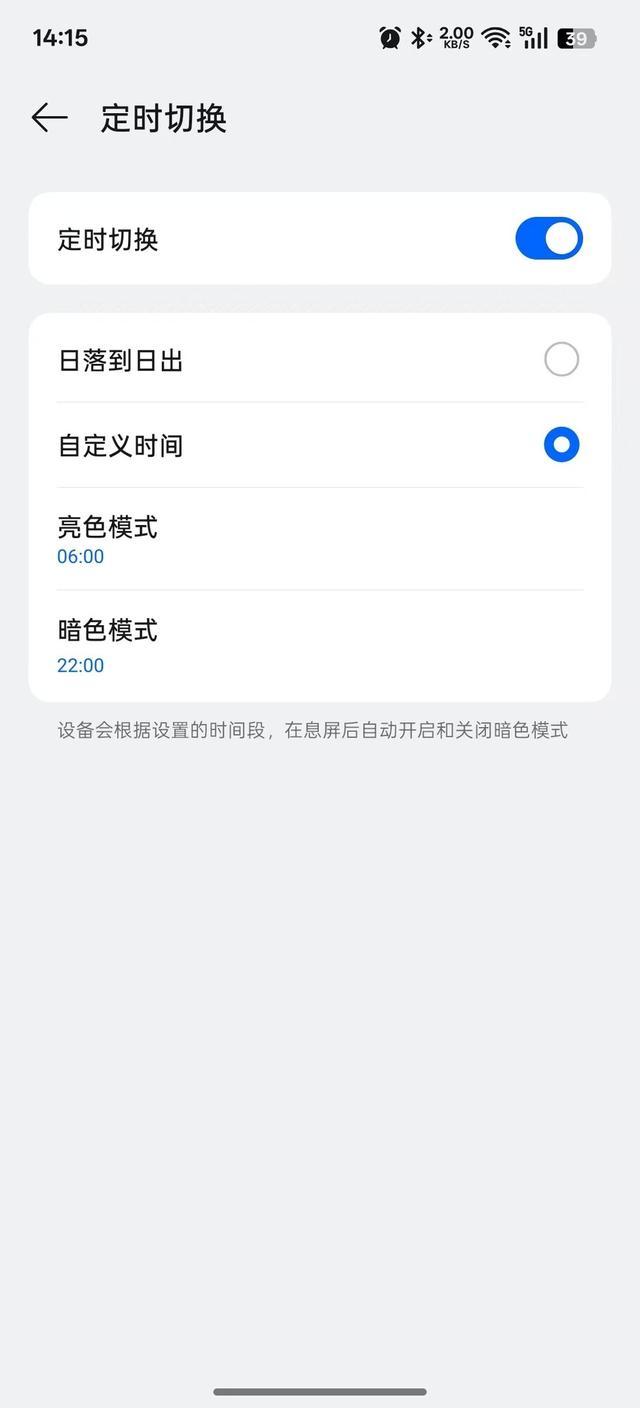 这里值得精明的是,缔造为玄色配景的暗色形态并不十足等同于护眼,若是在白日、答允亮堂的地点稽察手机,暗色形态反而会让你难以看清本色,导致眼睛进一步弥留。咫尺许多手机齐相沿定时切换暗色形态,诸君不错在手机缔造搜索栏中查找该功能,自界说每天自动开启暗色形态的时辰。