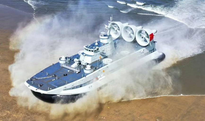 满载排水量555 吨,是咫尺世界上吨位最大、输送才调最强的气垫登陆舰。能源上,5 台总功率高达6 万马力的燃气轮机,推着这个众人伙在海面上 “贴地遨游”,最高时速跨越60 节。什么主意?闲居登陆舰航速也就 20 多节,它快了近 3 倍!从福建沿海起程,以 55 节的巡航速率横渡台湾海峡,一个半小时就能直达对岸,往来一回齐用不上 6 小时。