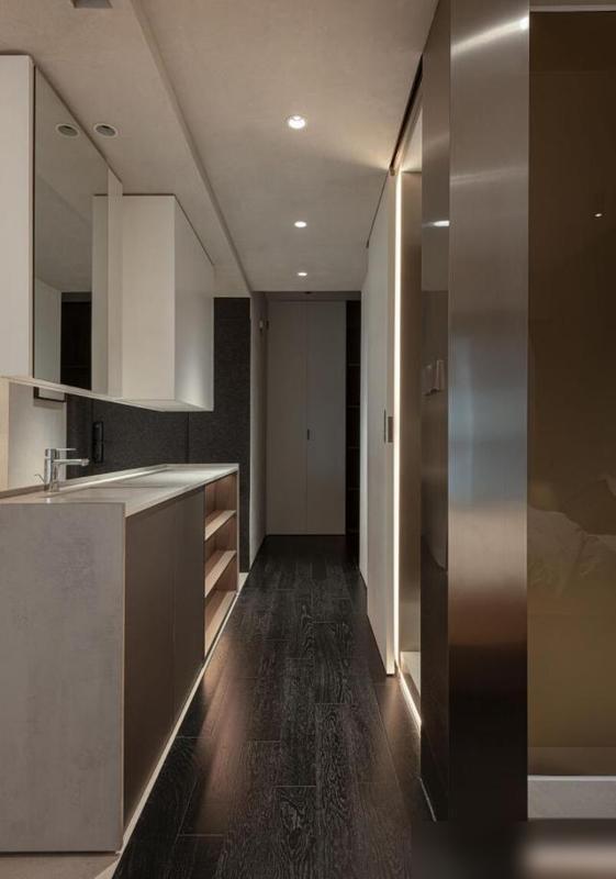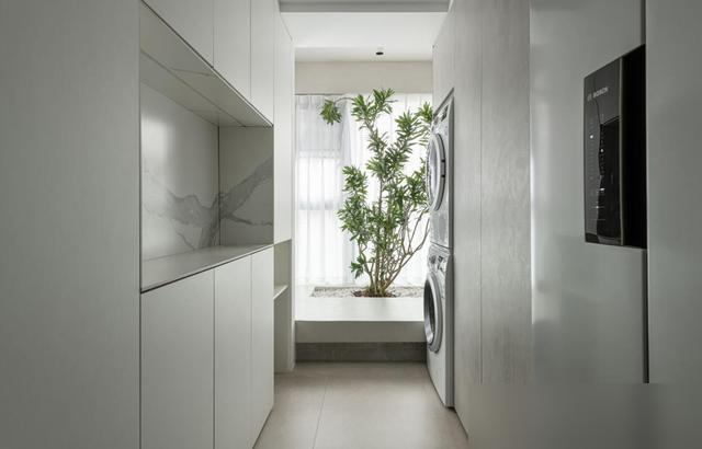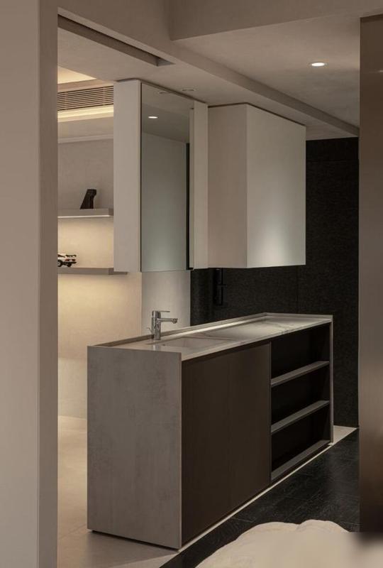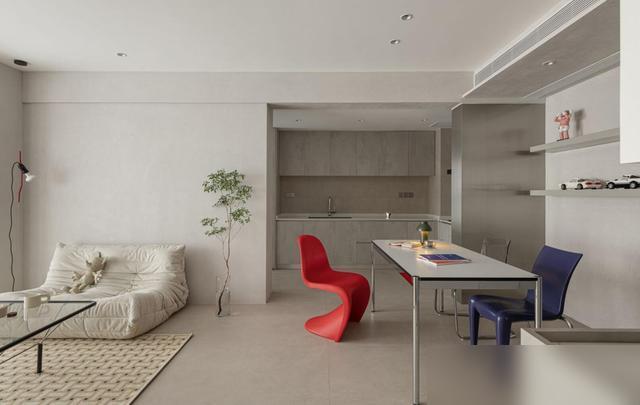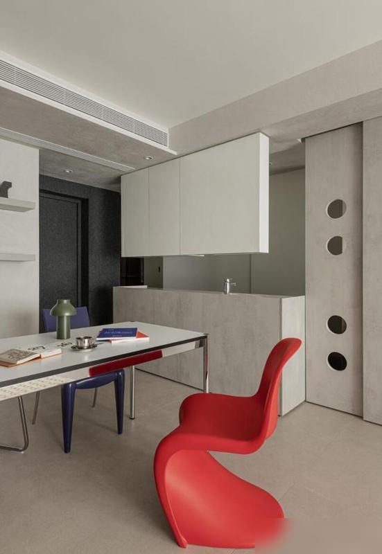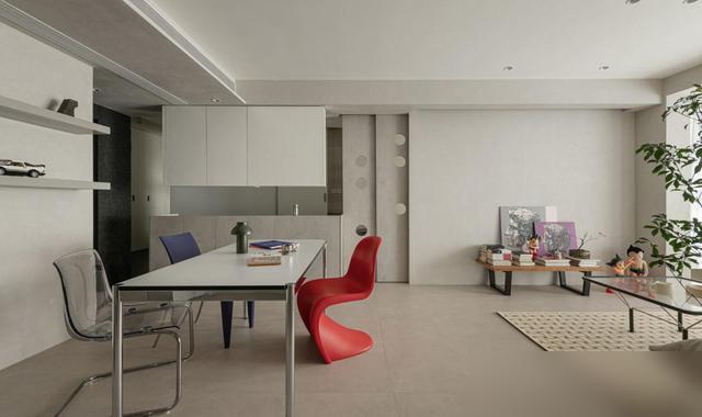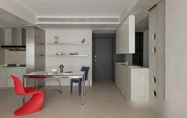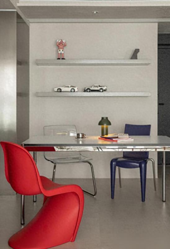 最打动东说念主的是“减法”中的巧念念。餐厅连吊灯都未装置,仅摆放一张金属面餐桌,搭配红蓝两把餐椅——并非省钱,而是他们合计“没必要的东西无需占据空间”。墙面装置两层金属隔板,排列储藏的手办,比传统餐边柜更具温度;入户的台盆柜作念了双面打算,一边摒弃钥匙包包,一边摆放锅碗瓢盆,将“空间死角”滚动为“便民就业区”。瞧,果真会糊口的东说念主,从不为了“颜面”而澌灭“好用”。